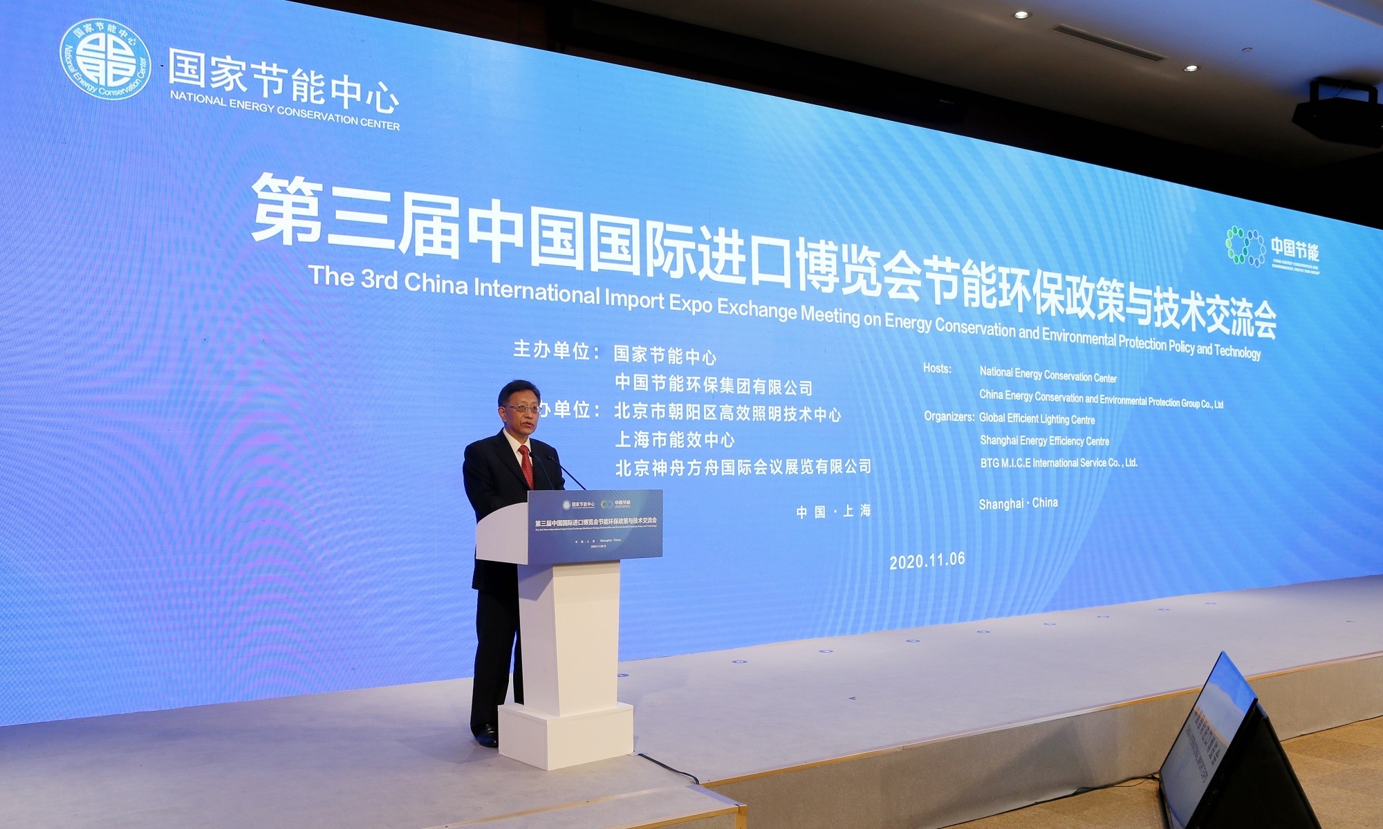 11月6日第三届进博会期间,中国节能与国家节能中心联合举办节能环保政策与技术交流大会及系列商务活动,并首次设置节能环保专区。国家发改委环资司二级巡视员宋常青、国际司一级巡视员李斌,联合国开发计划署、中国经济导报社、国家节能中心等有关领导出席会议。集团公司党委书记、董事长宋鑫出席会议并作主旨发言。